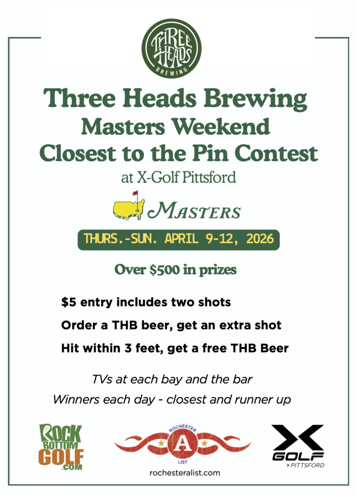 Gather with golf friends at X-Golf Pittsford on Friday, April 10, 5:30–8 PM at the Friday Cut Line Party. Watch the second round of The Masters on TVs at every bay and the bar while enjoying Masters-themed food and drinks, contests and prizes. Your ticket includes the Rock Bottom Golf Putting Contest and the Three Heads Brewing Closest to the Pin Contest with prizes, cash and food and beverages to win. Sip a free beverage, and sample Georgia pecan caramel popcorn and pimento cheese popcorn from Tony’s Popcorn. Choose a golf ticket and bring your own foursome or be paired-up with other golfers, or grab a 19th Hole Ticket.